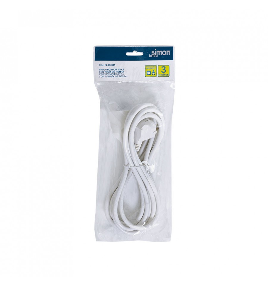 Prolonga las conexiones en 3 metros con el prolongador blanco de la marca SIMON BRICO. Este prolongador es válido para las tomas 16 Amperios con toma tierra por su cable con sección 3G1,5mm².