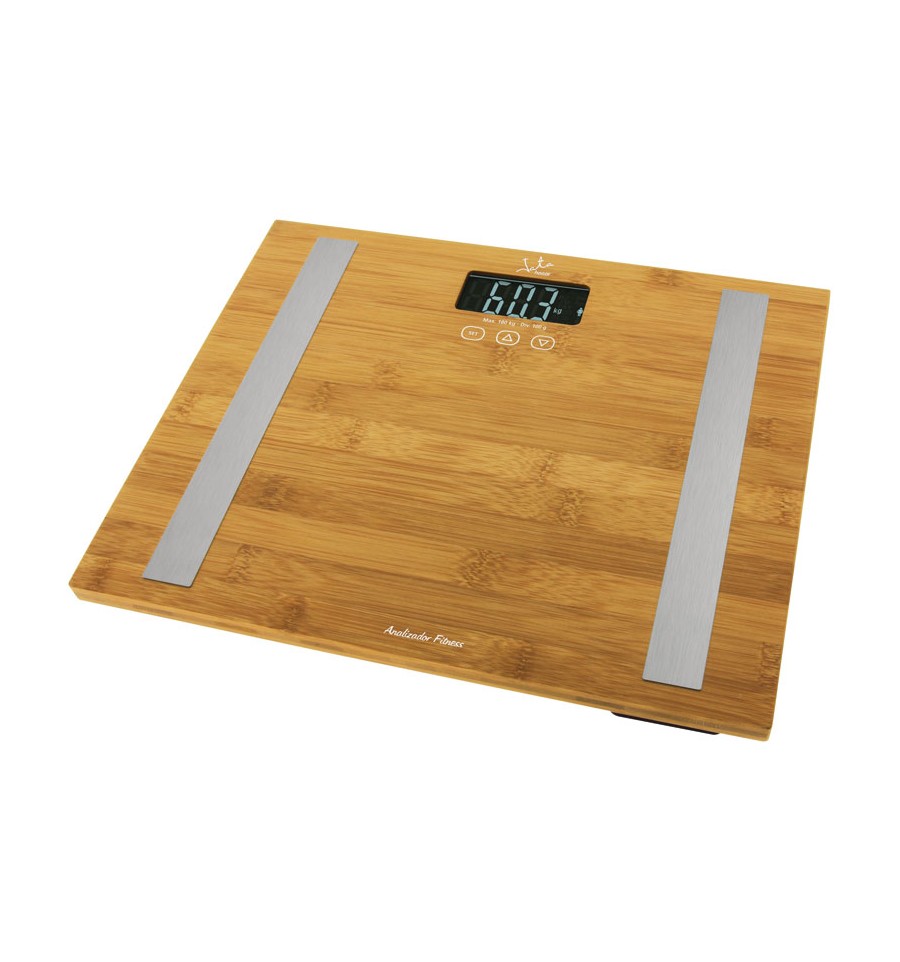 Analizador fitness con superficie de bambú analiza tu masa muscular, masa ósea y proporción de grasa y agua, y te informa del peso y las calorías.