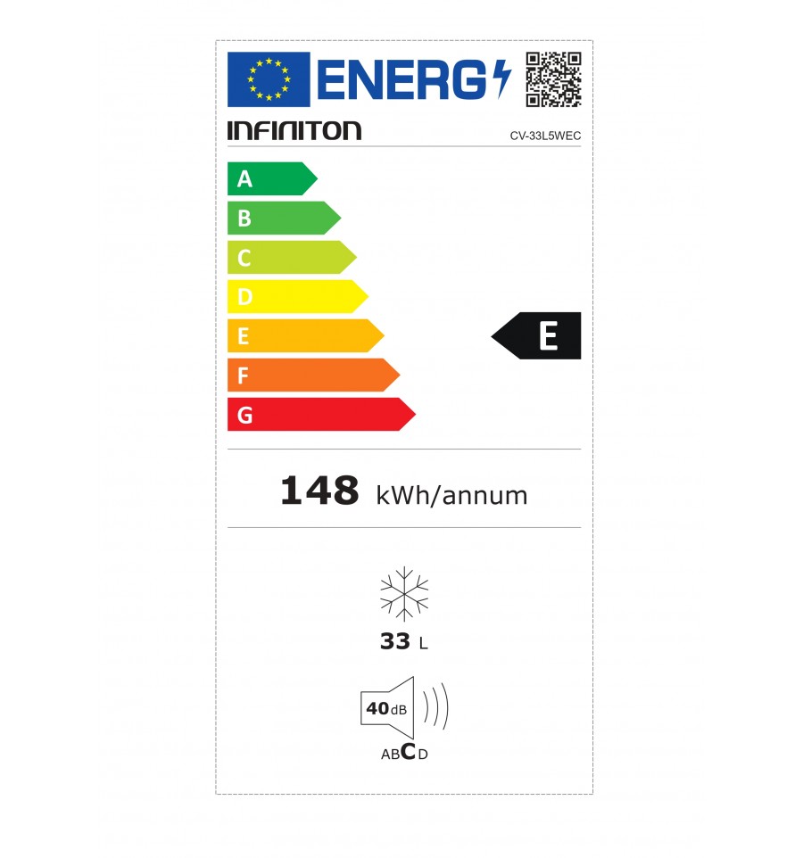 El congelador vertical Infiniton CV-33L5WEC se caracteriza por tener una capacidad de 33 Litros. Gracias a su clasificación energética E percibirás un importante ahorro energético en tu factura de la luz.