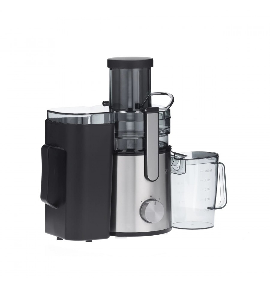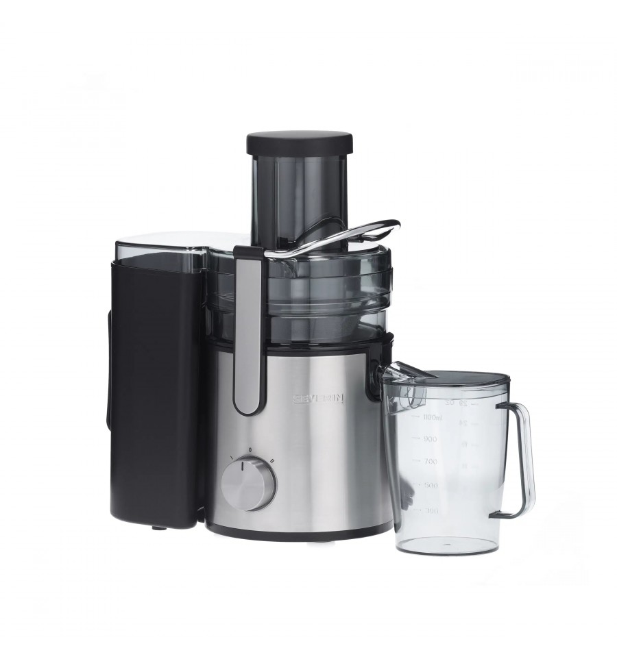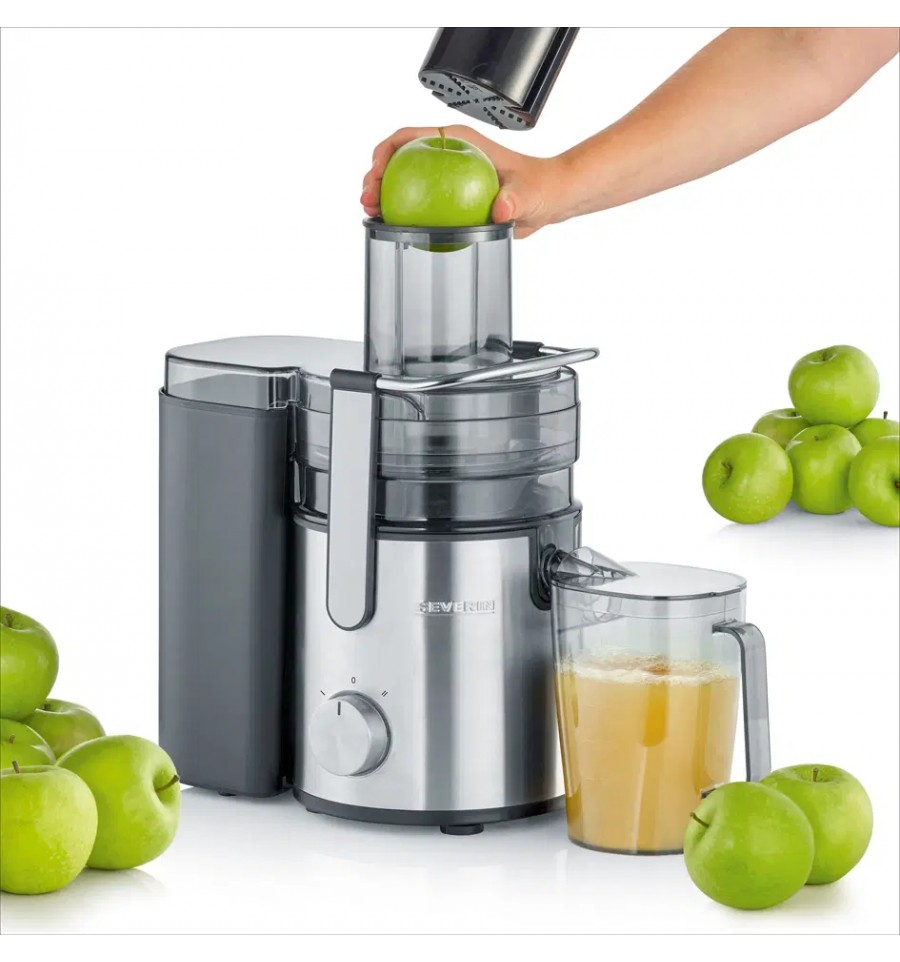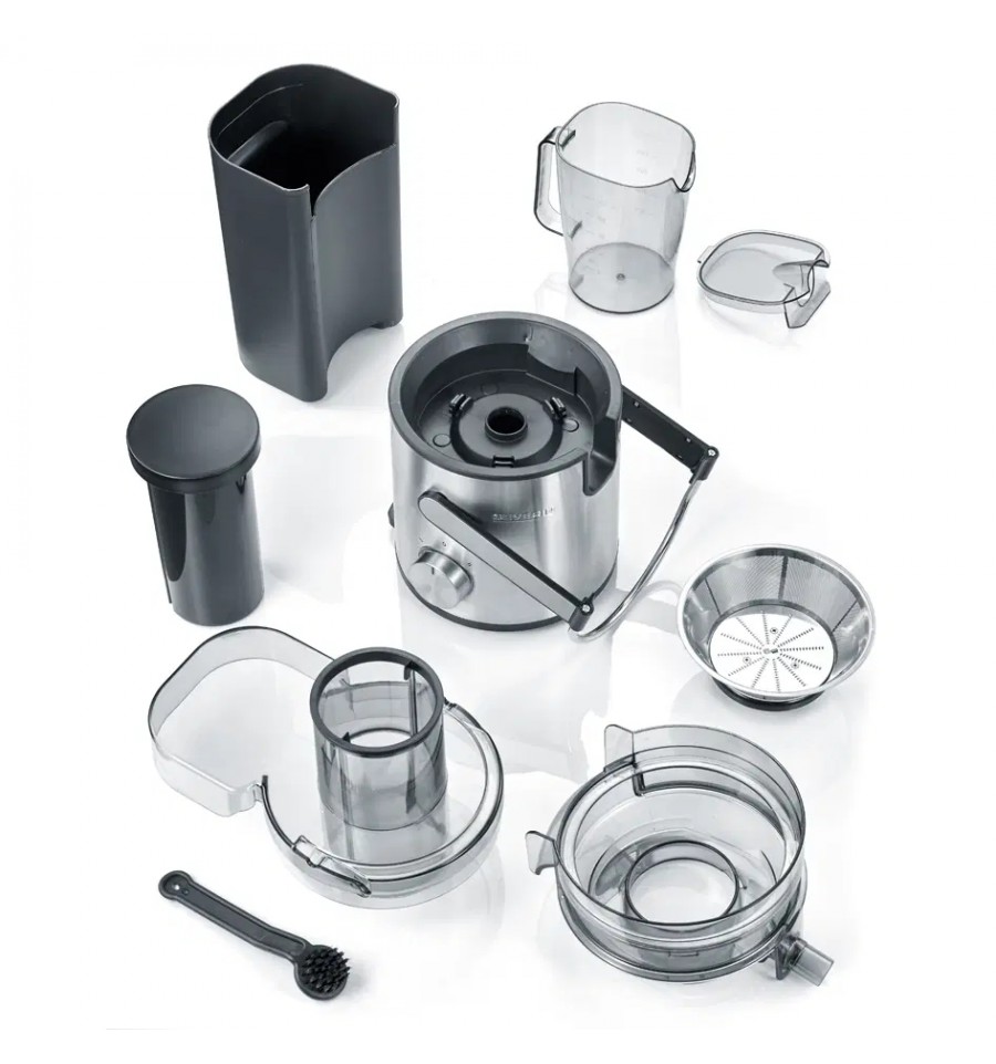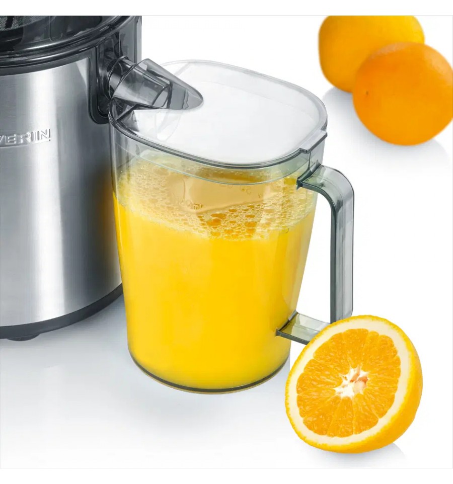 Esta licuadora profesional destaca por sus dos niveles de velocidad y por alcanzar un máximo de 19 000 revoluciones por minuto. La boca de llenado XXL de 7 cm de diámetro permite introducir fruta y verdura entera. En el recipiente recolector de zumo caben unos 1100 ml. La espuma se separa del zumo. Delicias saludables en un abrir y cerrar de ojos.