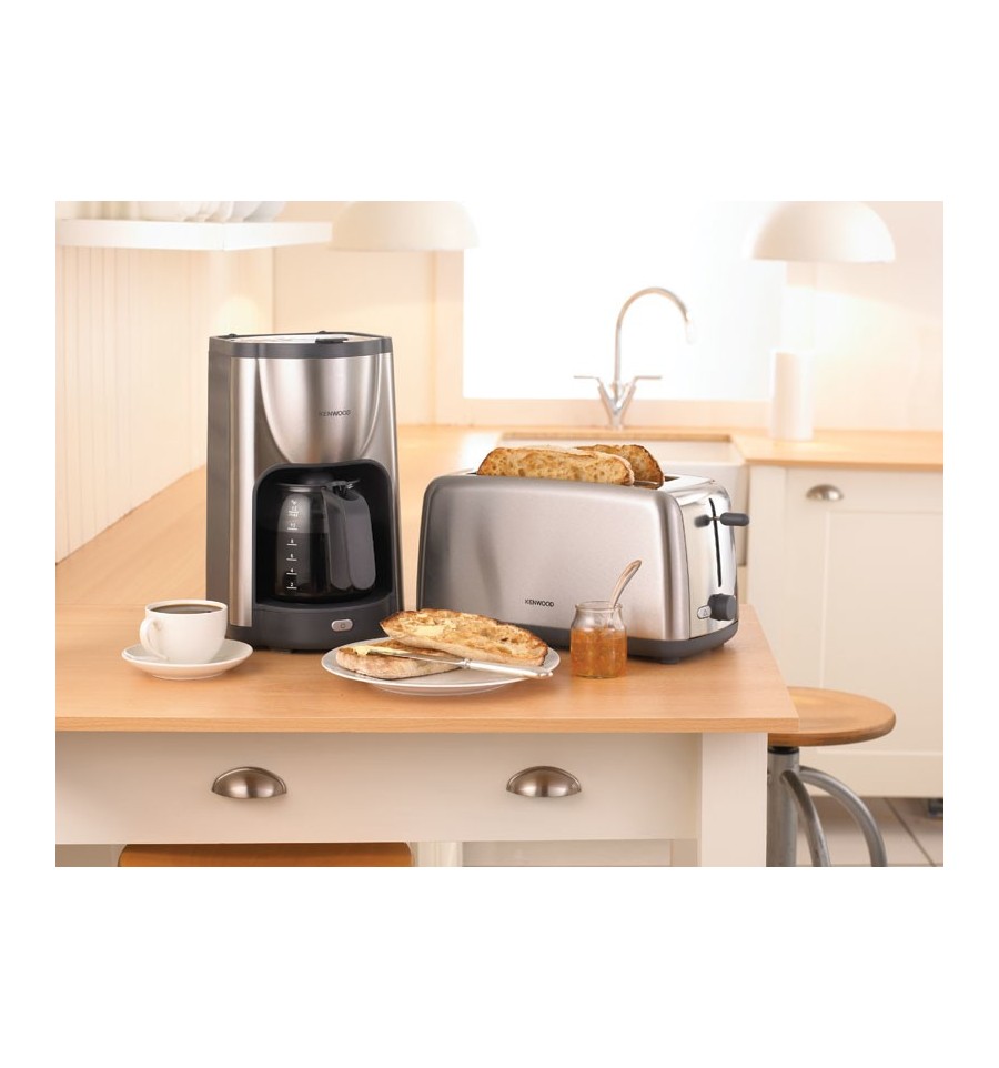 Elegante tostador eléctrico de metal pulido con dos ranuras largas. Es una tostadora muy práctica y sencillo de utilizar.