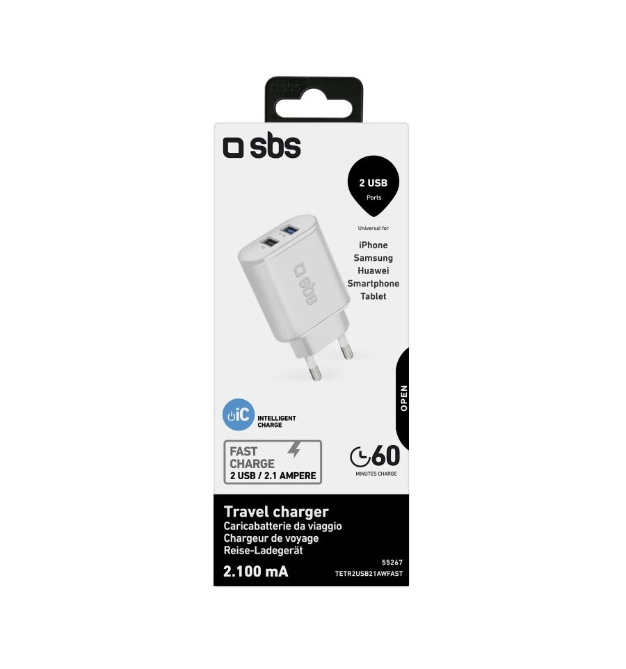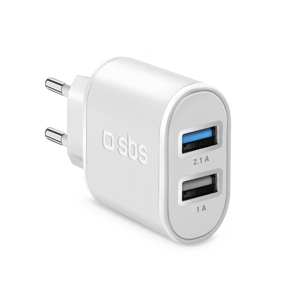 El cargador, equipado de un enchufe de pared tipo europeo, permite cargar dos dispositivos a la vez gracias a sus dos puertos USB de 1A y 2,1A. El puerto USB de color azul está equipado con la tecnología Intelligent Charge.
