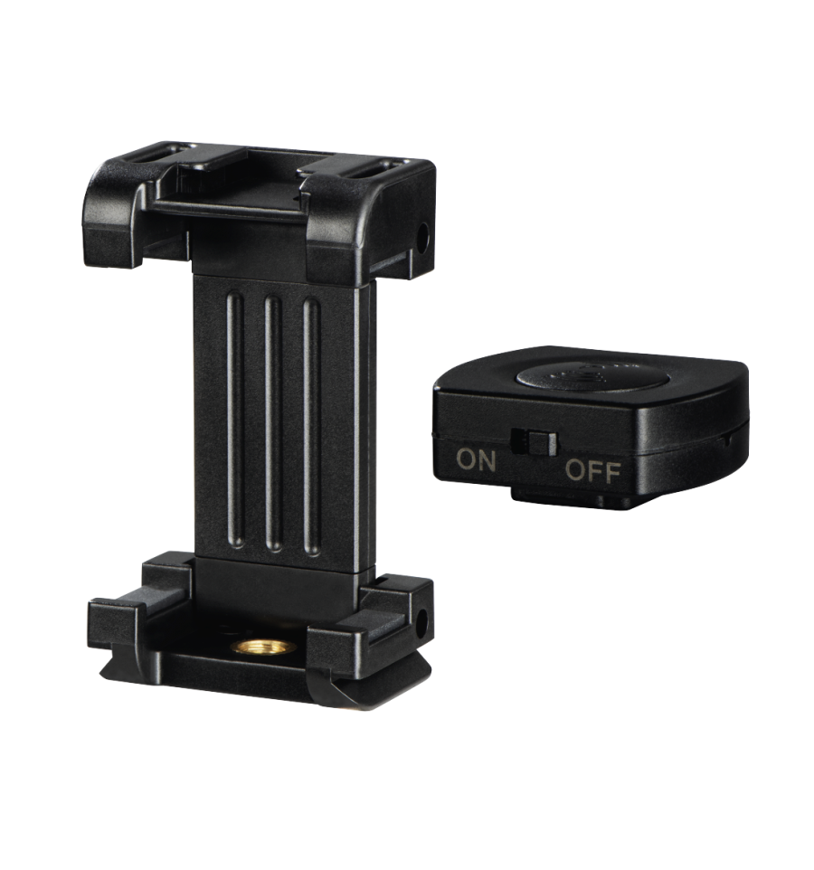 Set compuesto por un soporte para smartphone y un disparador remoto Bluetooth para hacer fotografías con el smartphone de una manera flexible y versátil