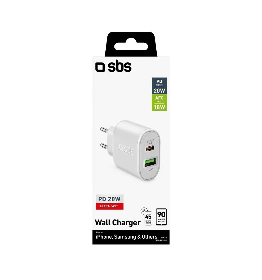 Este cargador se puede conectar a cualquier enchufe de pared de tipo europeo. El puerto USB-C está equipado con la tecnología Power Delivery: este sistema permite cargar de forma ultrarrápida tu iPhone o cualquier otro tipo de smartphone, tablet o iPad compatible con el protocolo PD. La potencia de 20 W permite una carga muy rápida y segura que llevará la batería de tu smartphone al 100 % en solo 45 minutos y la de tu tablet en 90 minutos.*