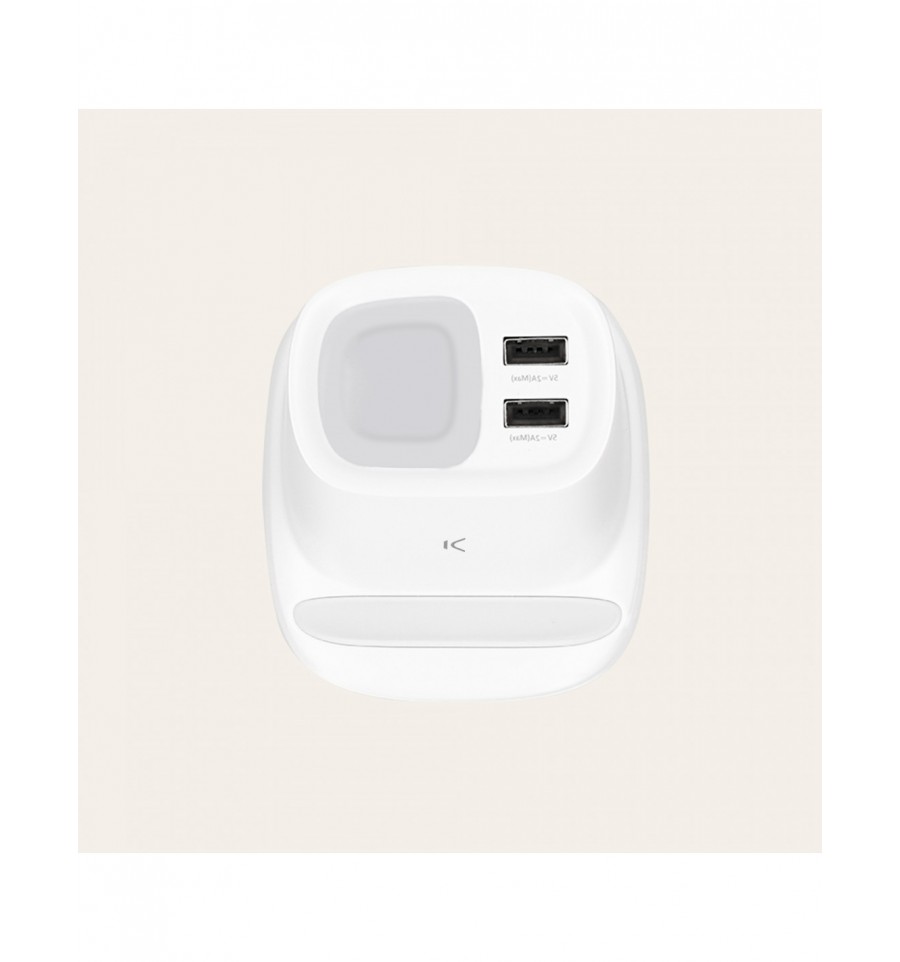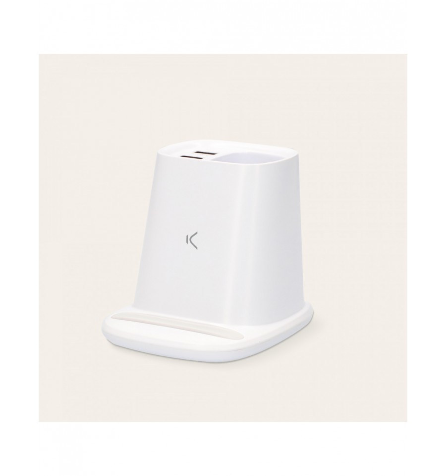 Cargador inalámbrico multifunción con potencia de 10W. No sólo permite la carga inalámbrica de alta velocidad, también incorpora 2 puertos USB para conectar otros detalles y, además, hace función de soporte y de lapicero.