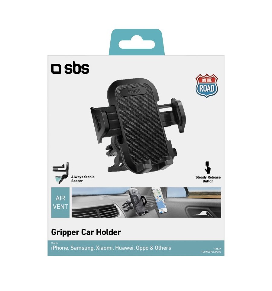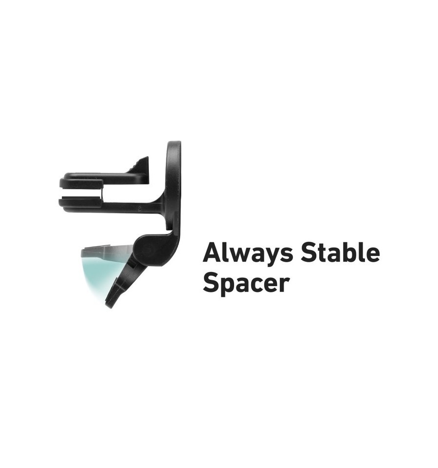 El soporte para coche con agarre extrafuerte se fija a la mayoría de las rejillas de ventilación gracias al práctico clip ajustable. El espaciador, colocado bajo el clip, evita cualquier oscilación al bloquearlo en la parte inferior de la rejilla de ventilación.